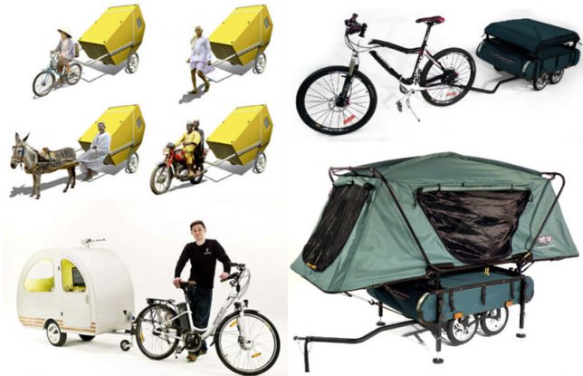 Choosing to ride a bike instead of driving a car doesn’t have to mean foregoing the convenience of a camper trailer, though such options may require especially clever construction (not to mention physical endurance) in place of motorized assistance (or at least: an electric assist bicycle).