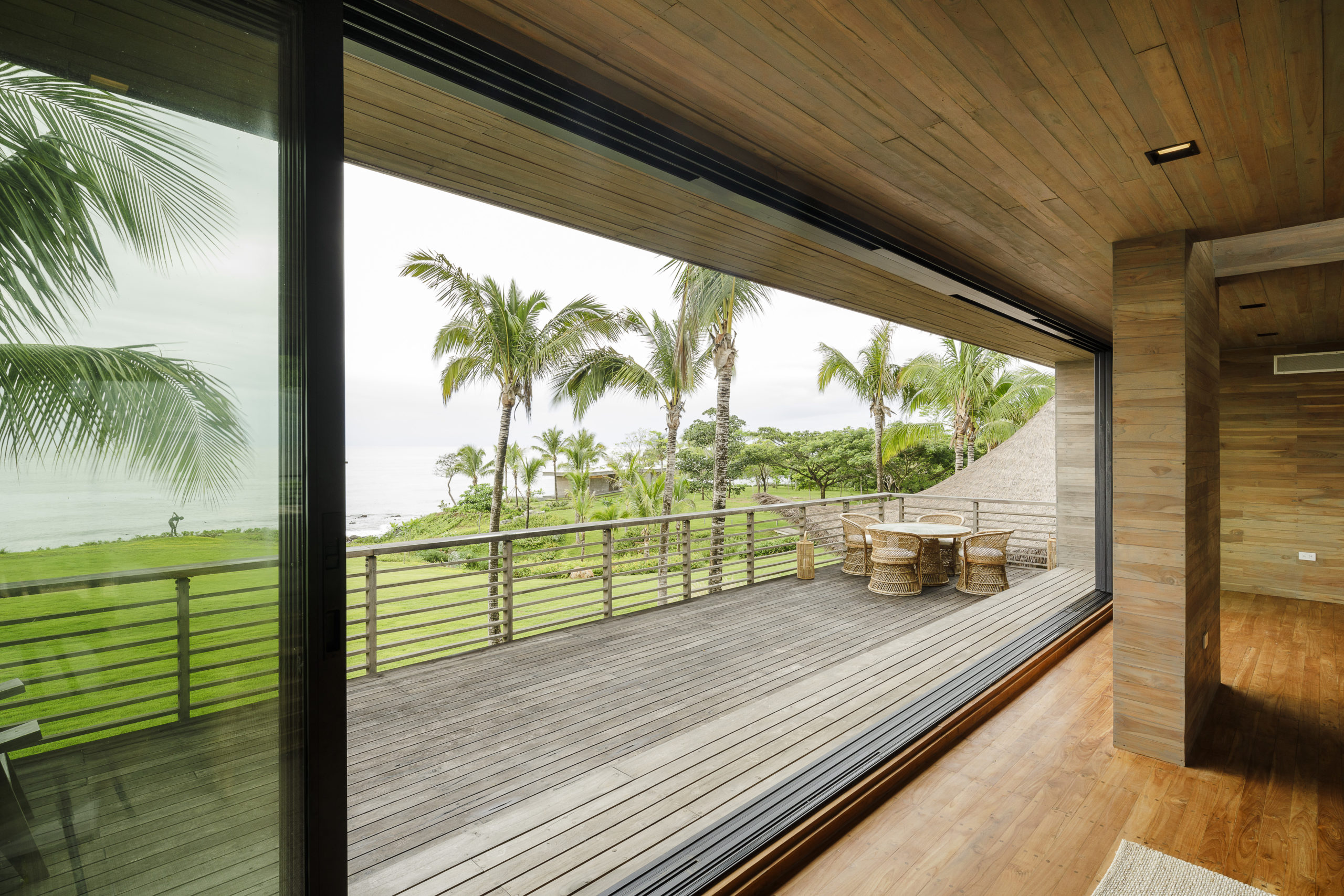 Utilizing LaCantina’s sliding door systems, the façades of each pavilion are fully operable. When opened, the perimeter of the interior spaces become permeable and create a single larger room including the adjacent garden spaces and the ocean at the horizon. “When passing through the modern pavilion — from the vestibule into the outdoor living room — you are compressed and released into the vastness of the outdoor living room which looks out to the sea and the surrounding playful roof forms. It is meant to be an exciting, all-encompassing transition,” said the architects.