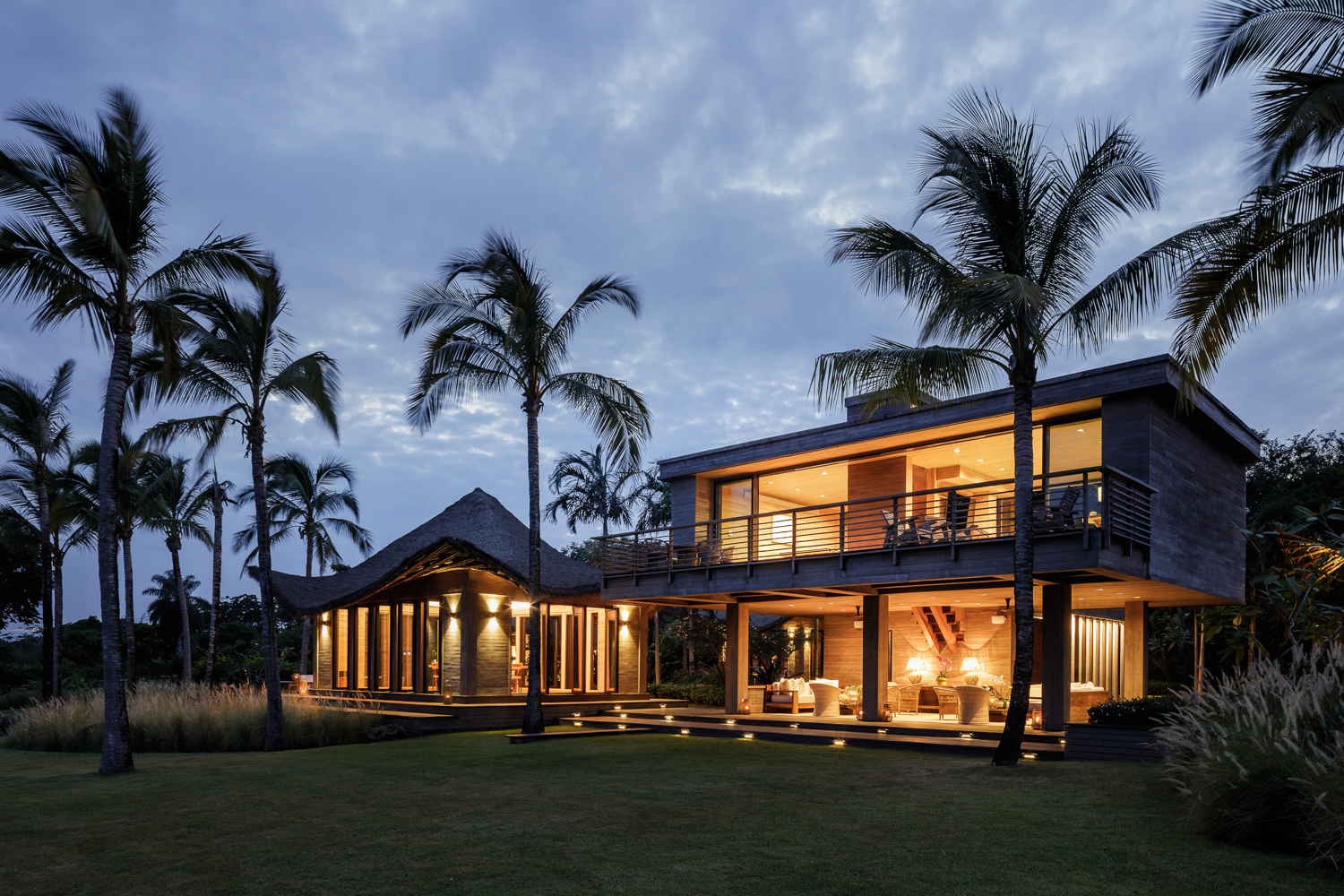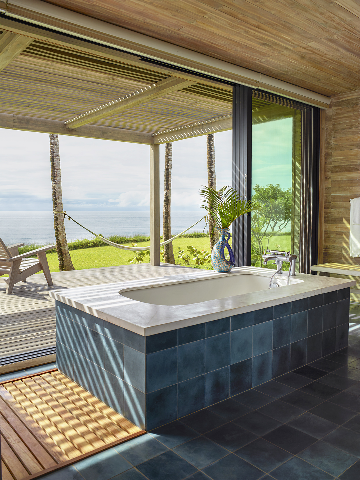 Utilizing LaCantina’s sliding door systems, the façades of each pavilion are fully operable. When opened, the perimeter of the interior spaces become permeable and create a single larger room including the adjacent garden spaces and the ocean at the horizon. “When passing through the modern pavilion — from the vestibule into the outdoor living room — you are compressed and released into the vastness of the outdoor living room which looks out to the sea and the surrounding playful roof forms. It is meant to be an exciting, all-encompassing transition,” said the architects.