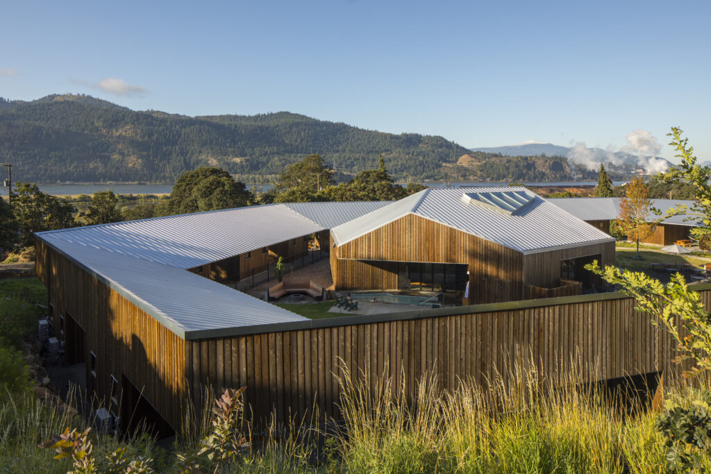Located in the Columbia River Gorge National Scenic Area, The Society Hotel offers stunning views of the river, surrounding hills and basalt outcroppings. The program includes the adaptive reuse and conversion of a former schoolhouse and gymnasium, twenty new cabins and terraces linked by a covered pathway, and an iconic, freestanding spa.