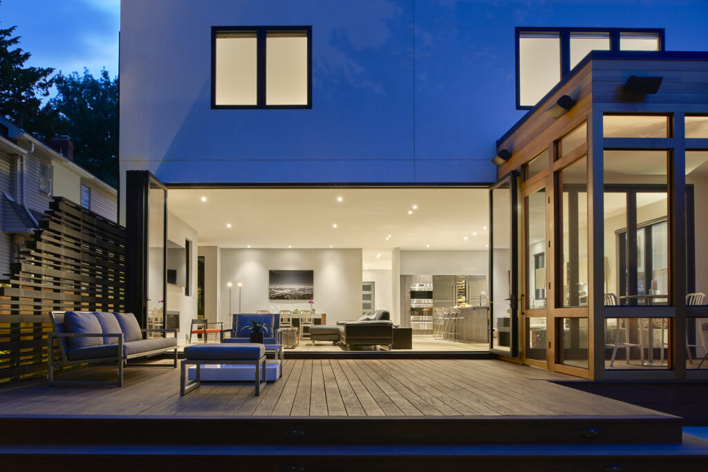 LaCantina’s Aluminum Outswing 3 and 6 Panel doors allowed for the interior to merge with the exterior, literally and figuratively: in the open position, the family room, deck and patio merge seamlessly; in the closed position they frame a view of the exterior with minimal obstruction.