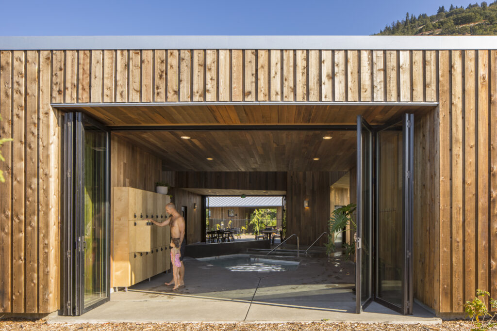 The architects continued: “We wanted the architecture of the spa to feel effortless and elemental, with as few materials and components as possible. The three openings between the cedar-clad ‘piers’ all wanted to open fully to the elements in good weather, and we also needed to protect against the snow and winds the Gorge is famous for at other times of the year.