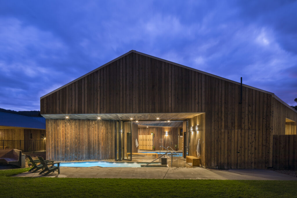 Designed by Oregon-based firm Waechter Architecture, this carefully crafted project involved the adaptive reuse of a historic school building into a boutique hotel, with the addition a ring of minimalist cedar cabins and a unique, polygonal bath house containing a series of relaxing pools, changing rooms, a sauna, a kitchen and two massage rooms.